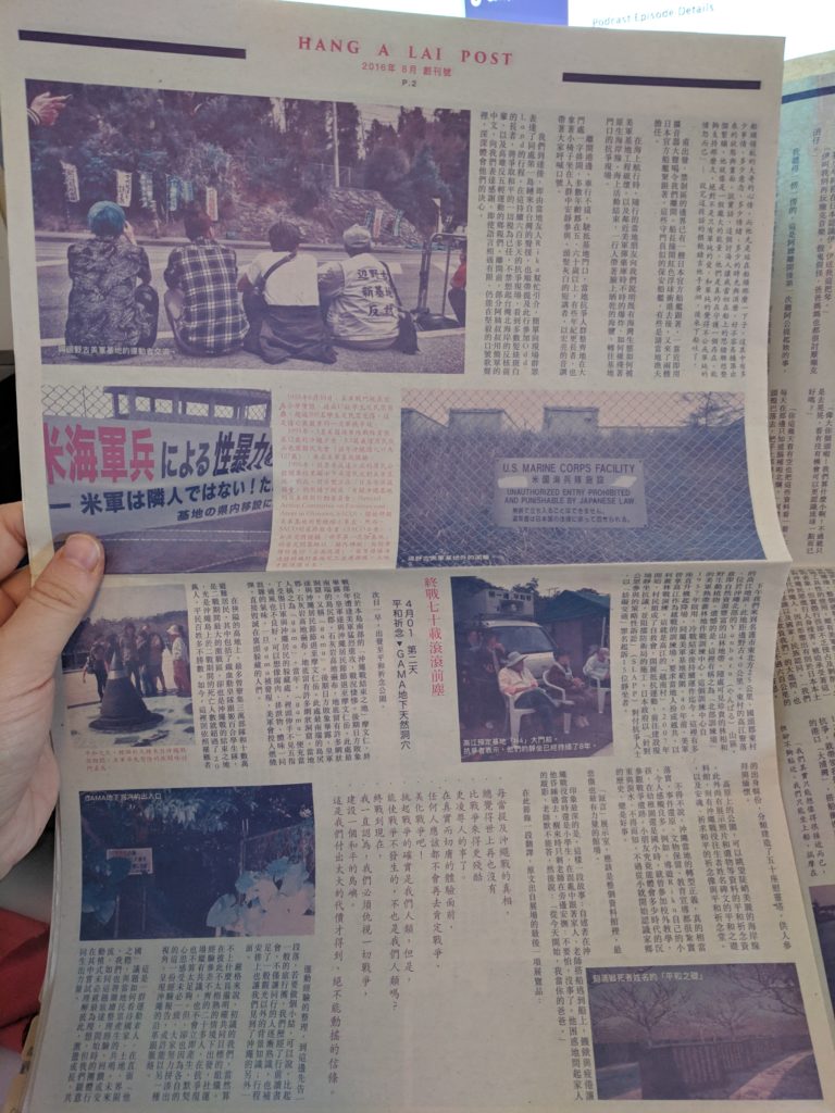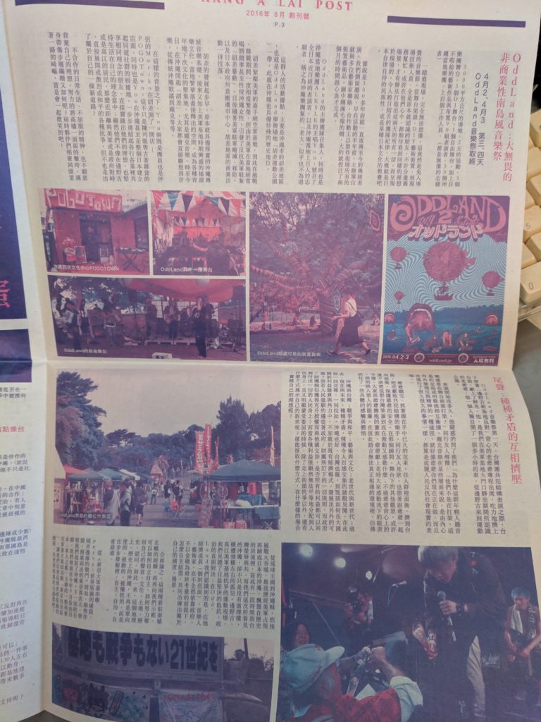 This is a pun on the word for anarchy in Japanese Idol group crashes the protestRecent community woodblock banner in support of the Okinawa peopleAhsiang and his friends made a zine in Mandarin, this is about solidarity in Okinawa between teens who came for the punk fest and local elders About OddLand festivalthe elevator in Manuke Guesthouse
